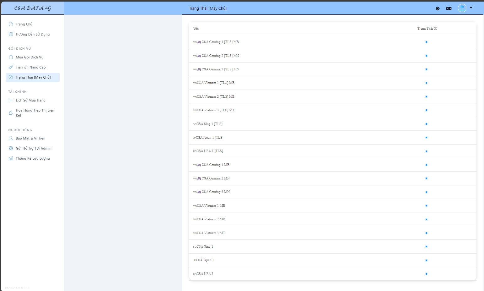 Để check server có đang hoạt động hay không, bạn lên trên trang web CSA DATA 4G, mục "TRẠNG THÁI MÁY CHỦ" để kiểm tra xem Server có hoạt động hay không