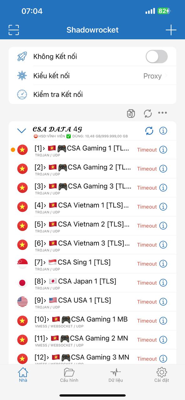 Khi bạn đồng bộ server về app, và bấm "Ping" hoặc "Kiểm Tra Kết Nối" thì nhận được là "TIMEOUT" hoặc "-1ms"
